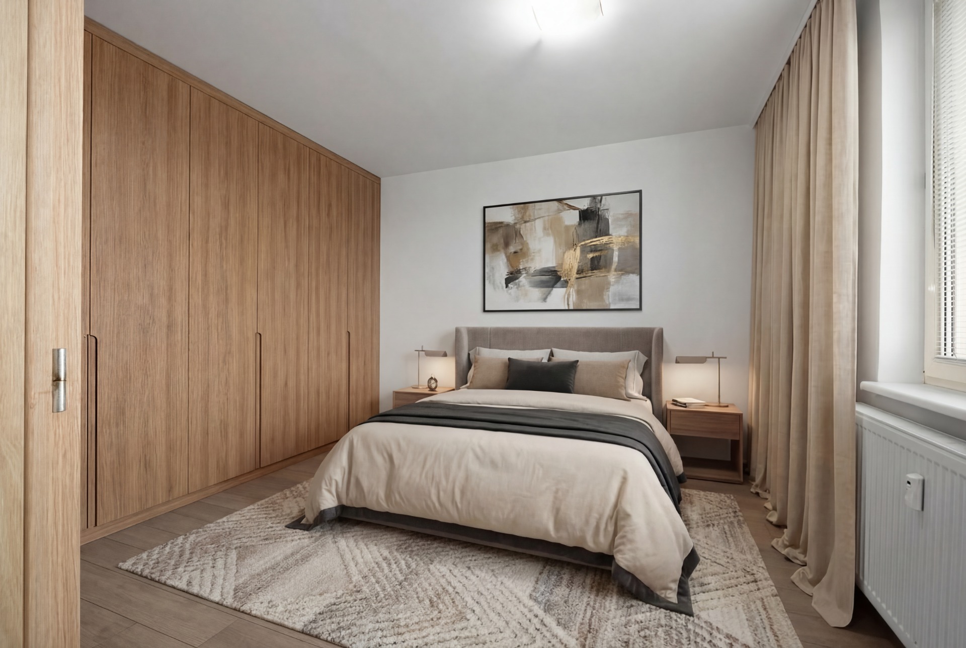 Byt je kompletne vyprataný, s výnimkou kuchyne a vstavaných šatníkov, a preto sme si pre Vás pripravili vizualizáciu nábytku.